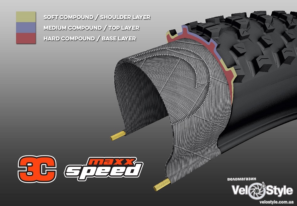 3C Triple Compound - предполагает использование жёсткого и долговечного базового слоя резины и двух внешних слоёв различной мягкости – это делается для того, чтобы оптимизировать сцепление покрышки с грунтом и повысить её стабильность при прохождении поворотов. 3C Maxx Speed - такой тип компаунда используется, в основном, в покрышках для кросс-кантри и эндуро. Верхние слои резины здесь расположены таким образом, чтобы снизить сопротивление качению и износ покрышки, но сохранить оптимальное сцепление с грунтом.
