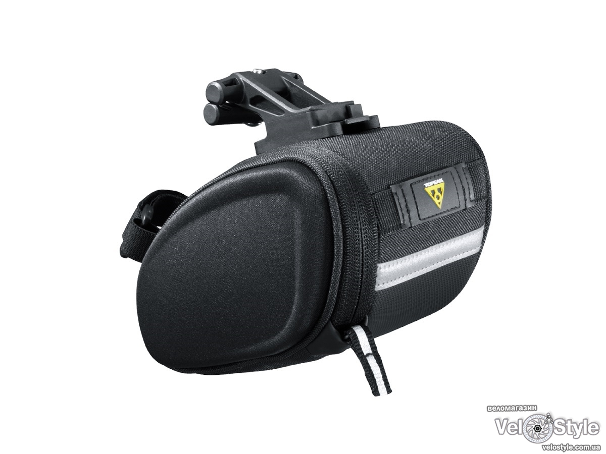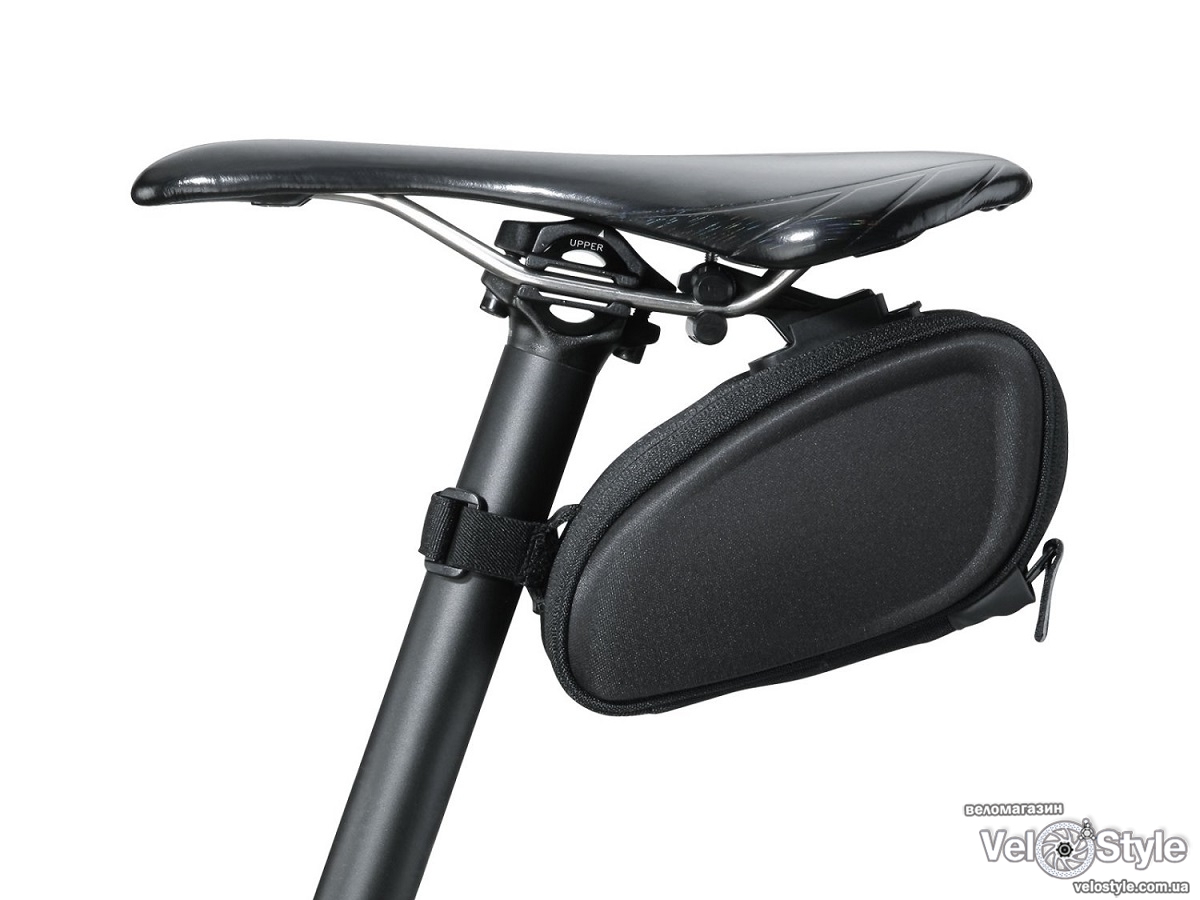 Новая идея в конструкции сочетает в себе формованные боковые панели с гибкой тканью плотностью 600 ден, образуя полужесткую устойчивую к погодным условиям подседельную сумку. Большая открывающаяся сбоку панель обеспечивает легкий доступ ко всему подседельному снаряжению. Внутренние сетчатые карманы удерживают ключи и мелкие инструменты на месте во время езды. Совместимость с QuickClick для быстрого и удобного переключения между велосипедами.